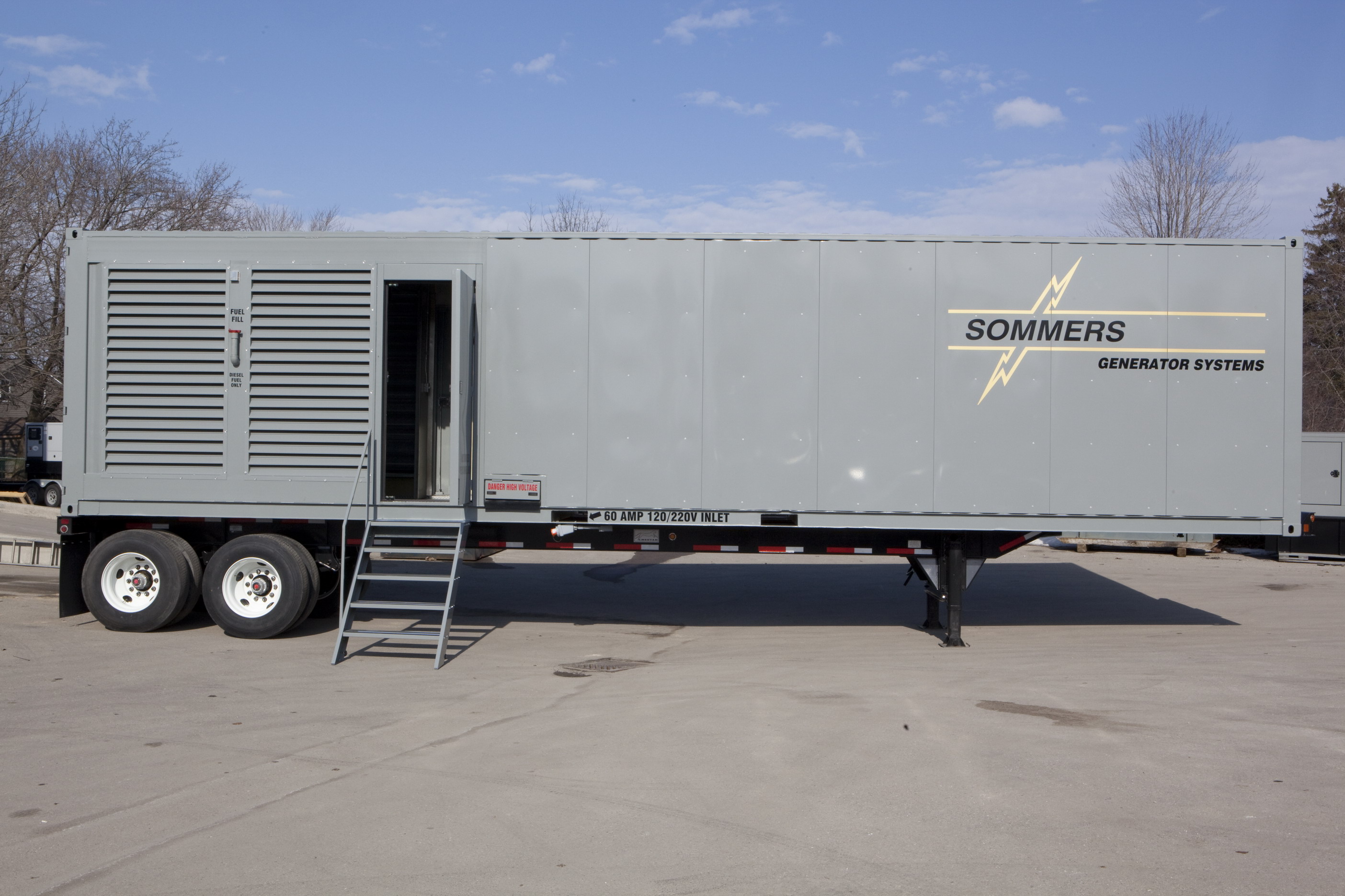 The system delivered by Sommers includes extensive sound attenuation features that meet the city’s goal of quiet operation in a downtown setting. The enclosure is a custom designed 40 ft. ISO container mounted on a DOT-approved trailer chassis, and includes a 3000 litre double-walled Transport Canada-approved fuel tank. The generator is driven by a 16 V-2000 Detroit Diesel G85 engine, producing a prime power rating of 1125 kVa, or the equivalent to 1250 kVa in standby service. Utility features include a 60 Amp Shore power receptacle for lighting, a space heater, engine heater and battery charger.