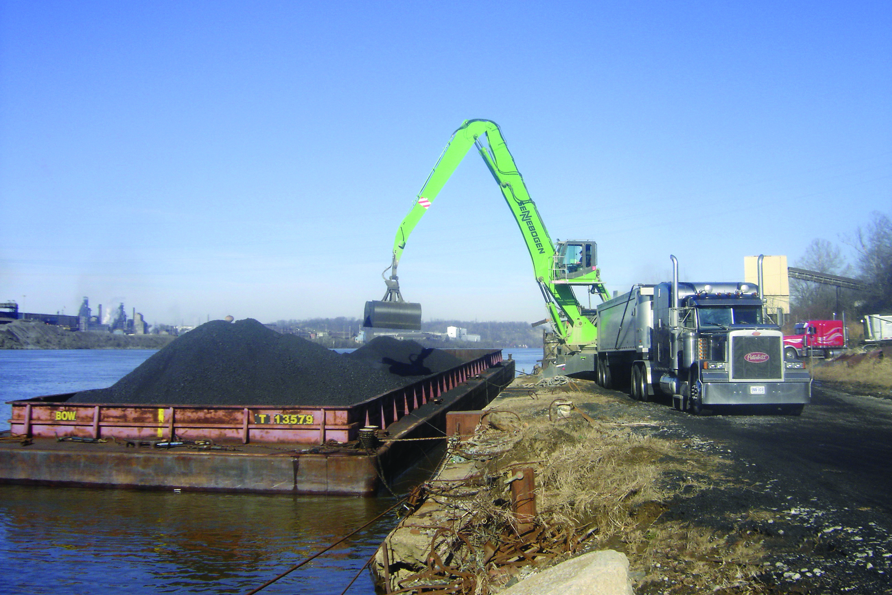 Greenup usually runs a single shift each day with the material handler unloading two barges each shift. Griffith is impressed with how quickly the green machine works. “The SENNEBOGEN has a 4-yard clam bucket, but it outperforms a cable crane with an 8-yard bucket. It runs much faster cycle times.” The bottom line for McGinnis is that the new hydraulic crane can unload a 1,600-ton barge in half the time of the cable crane it replaced.