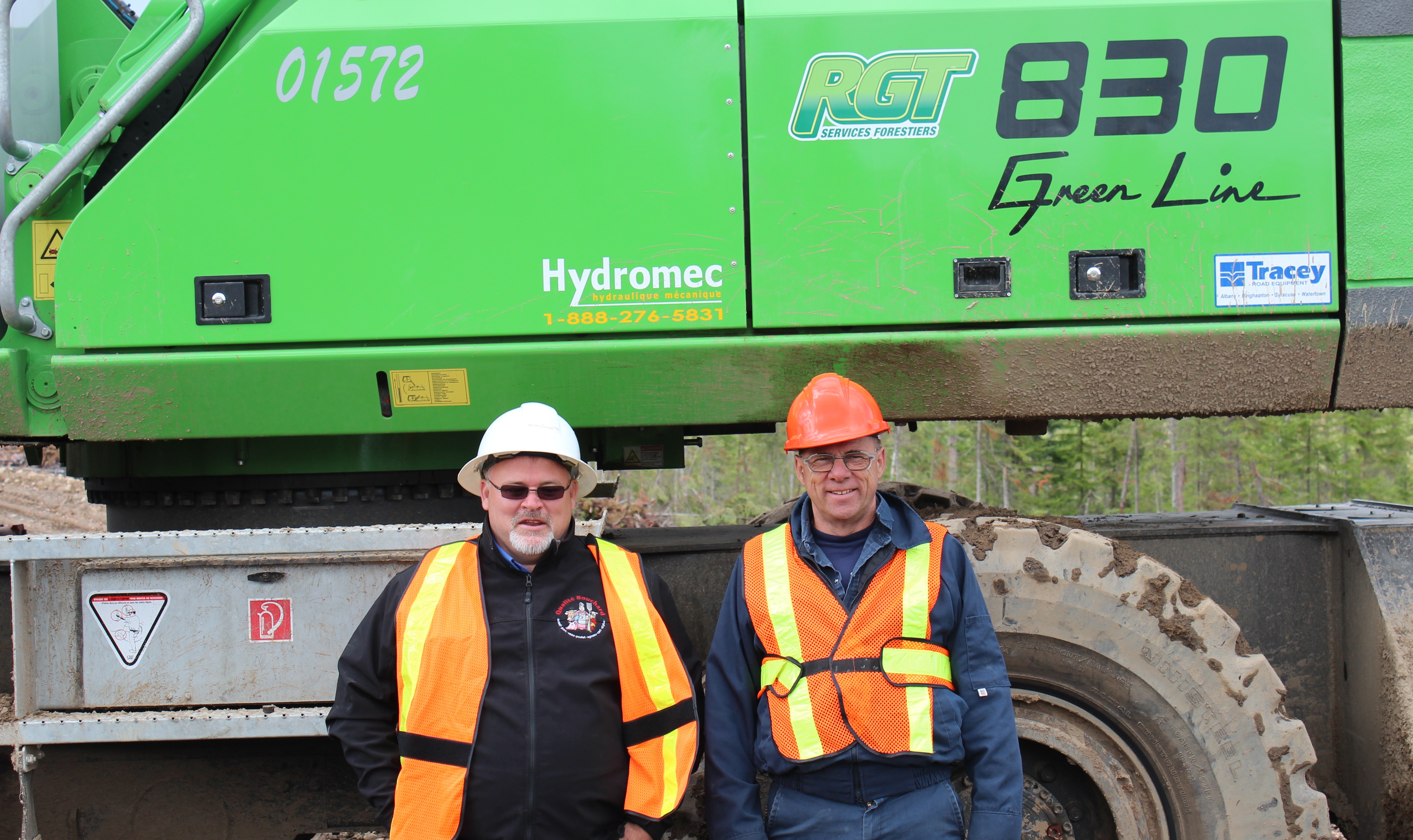 Luc Gauthier, right, of Services Forestiers R.G.T. has found a service and support provider he can rely on in the person of Bruno Collard, representing the local branch of SENNEBOGEN’s distributor, Hydromec Inc.