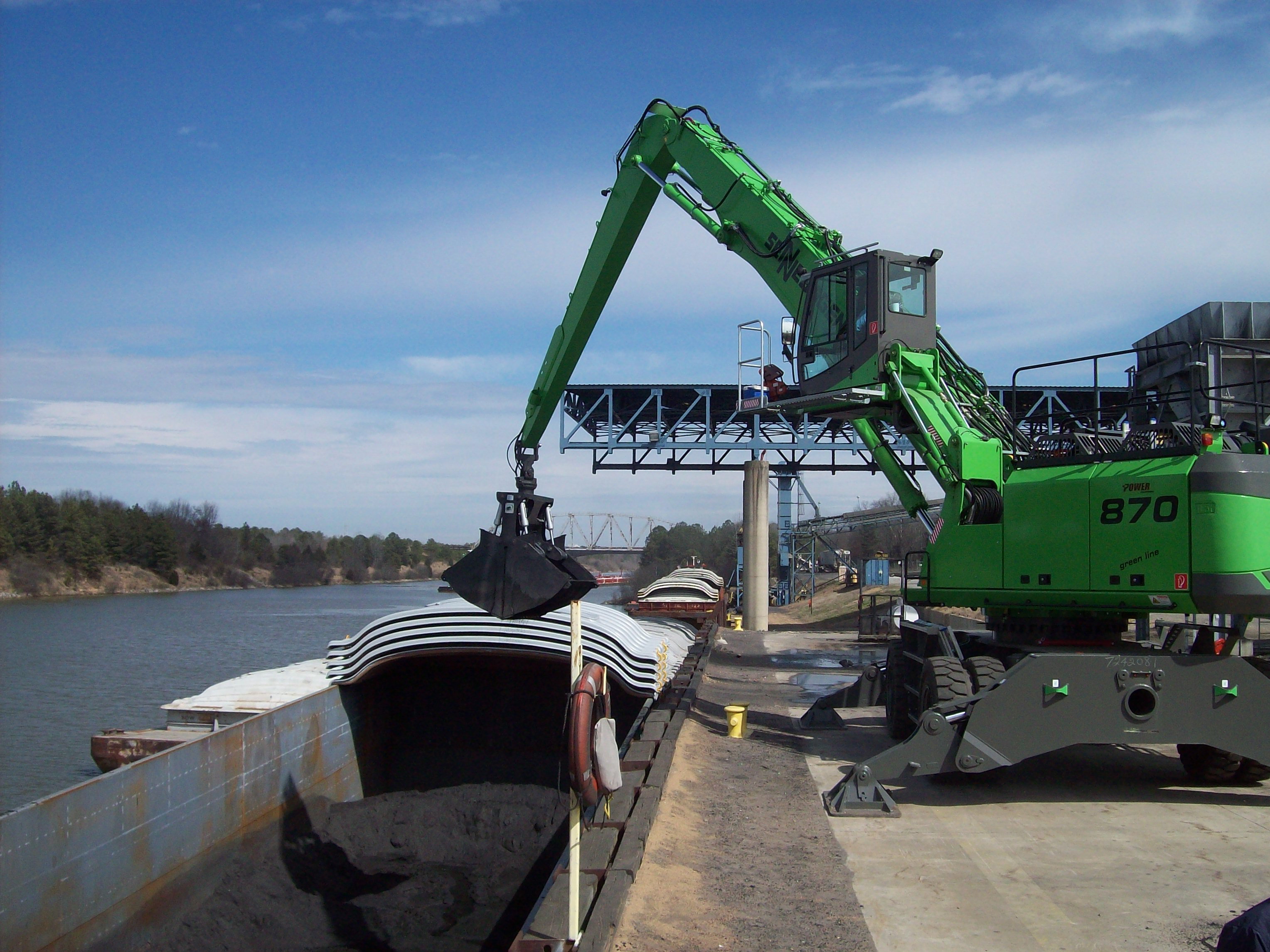 AMORY, MS – The transportation of bulk commodities is a vital aspect of shippers who depend on affiliated terminal facilities for the efficient transfer of their commodities. So when Kinder Morgan Terminals went looking for a way to reduce offloading times from cargo barges at its Amory, Mississippi terminal, it looked no farther than the SENNEBOGEN 870 M material handling machine.
