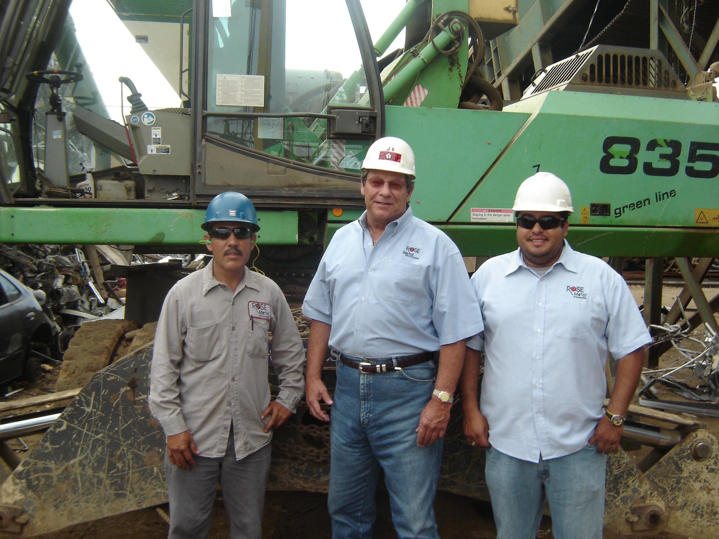 Rose Metal Processing representatives stand in front of one of the company’s two SENNEBOGEN 835 M material handlers. From left to right: Operator Robert Lorto; Owner/Operator Jerry Bailey; and General Manager of Operations Rolan Lemus.