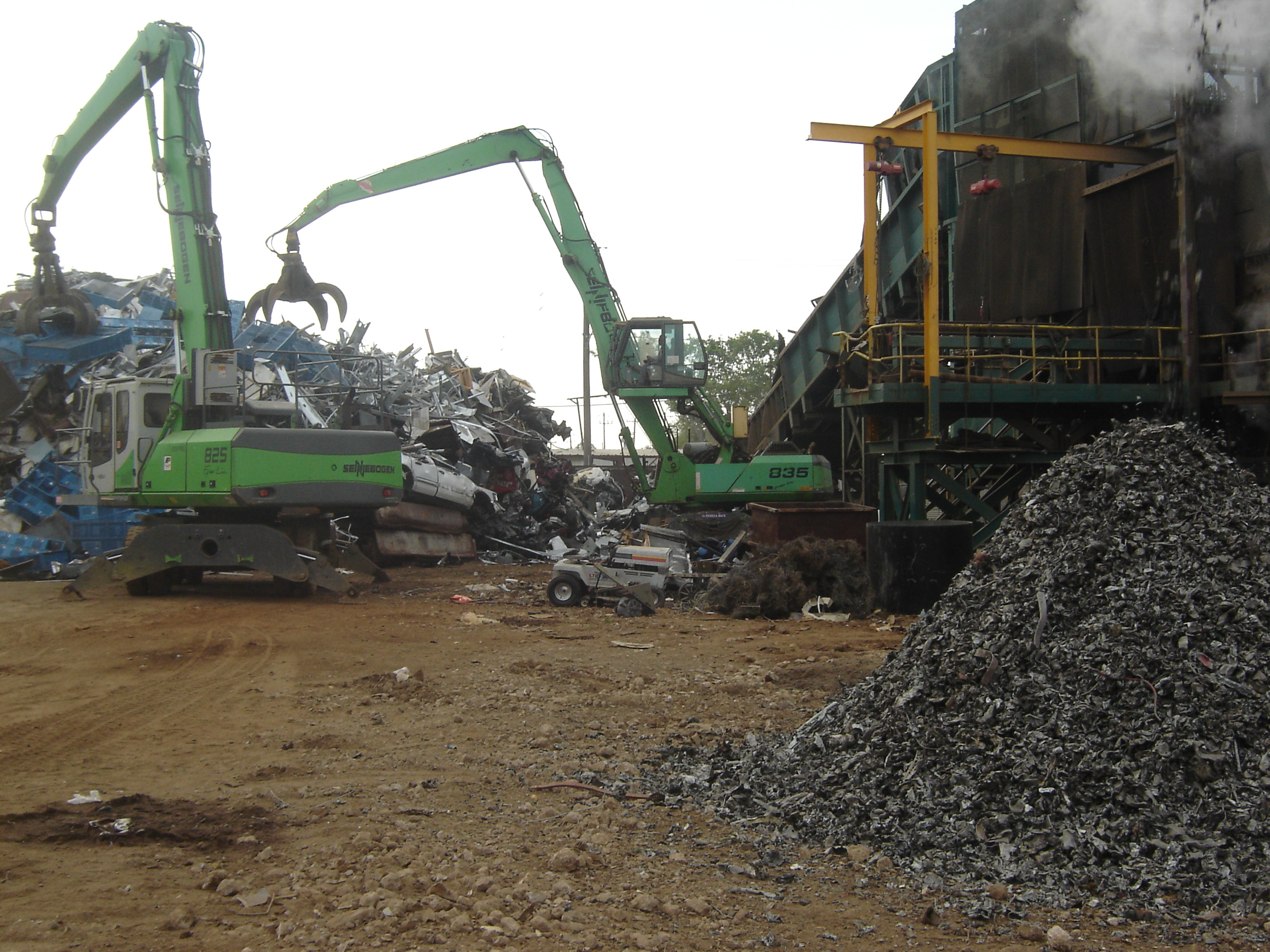 One of the SENNEBOGEN 835 M units is positioned directly beside the Newell 80104 shredder and is dedicated to feeding its inbound conveyor.The other 835 M unloads trailers that come into the yard and stacks the material for the 835 M that is feeding the shredder.